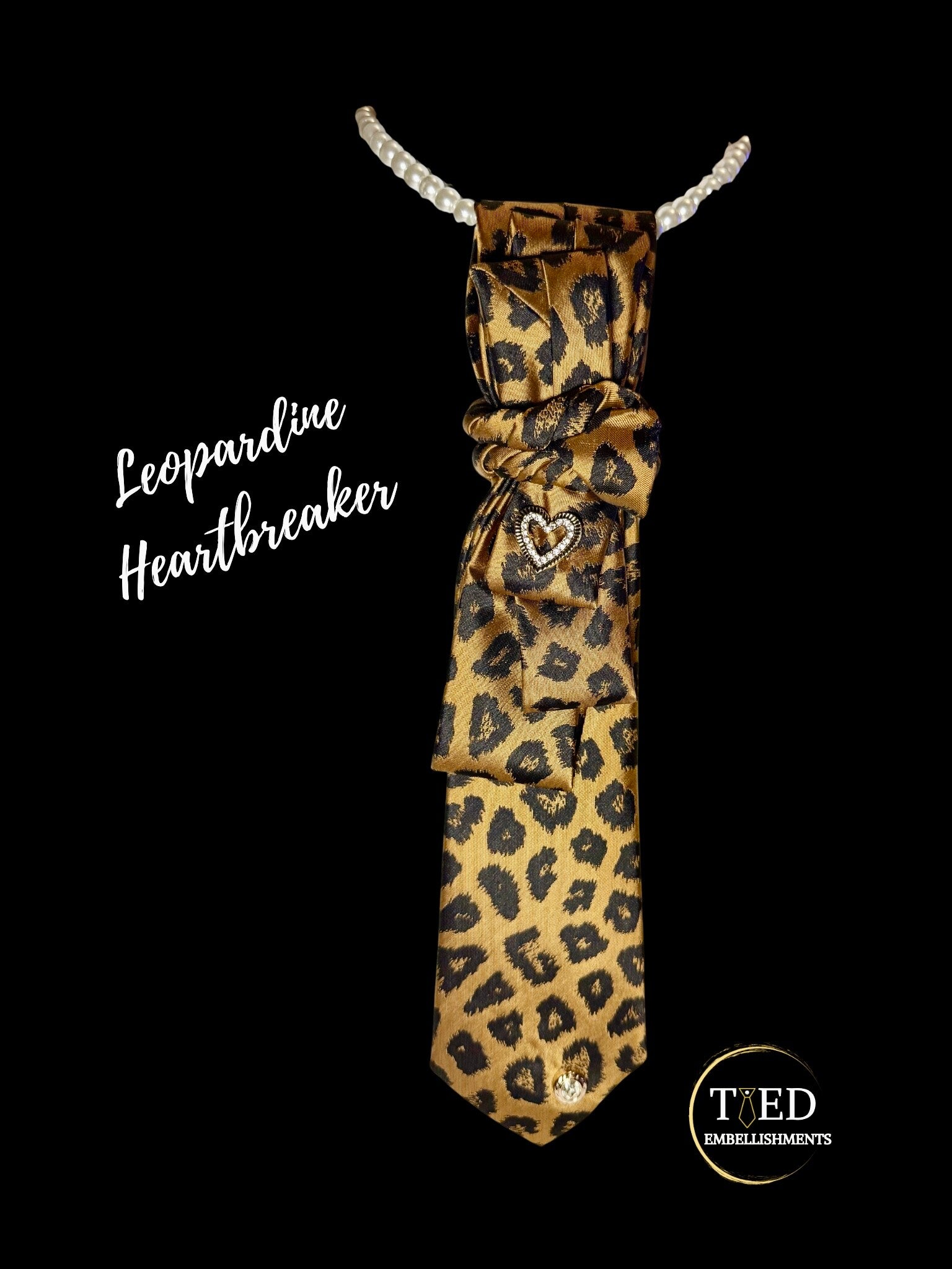 A declaration of wild glamour, Leopardine Heartbreaker blends untamed print with high‑fashion finesse. Its ruffled knot forms a dramatic rosette, crowned by a rhinestone heart that flashes like a secret dare. The leopard pattern prowls down the length of the tie, ending in a single jeweled drop that catches the light with every movement. Paired with pearls or worn alone, this piece transforms its wearer into the center of the room, bold, magnetic, and impossible to forget.