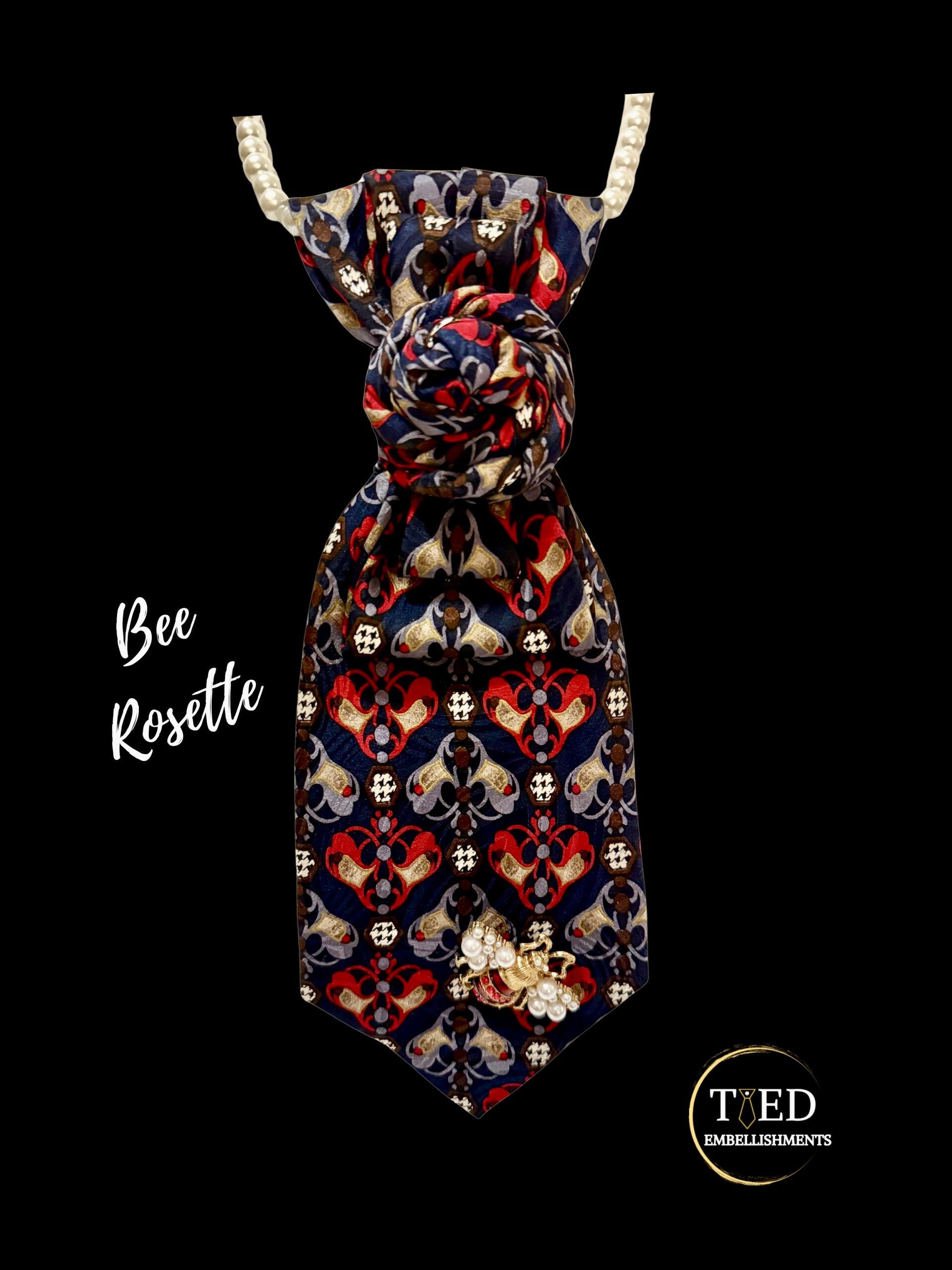 The Bee Rosette pairs a rich tapestry pattern with a sculpted rosette knot and a pearl‑studded bee, creating a piece that feels regal, symbolic, and quietly powerful. Its old‑world detailing gives it the presence of a modern heirloom.